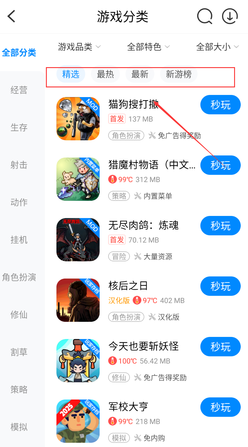 2、点击进入“游戏分类”页面,这里提供了多种筛选方式。