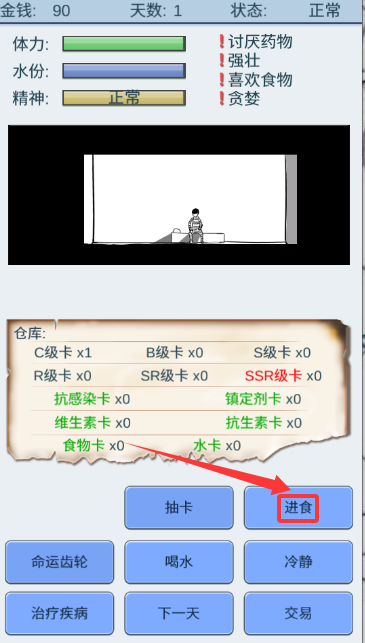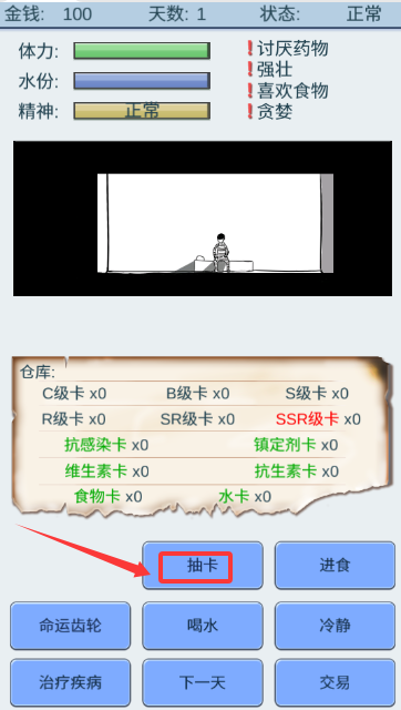 5、这也是生存游戏,抽卡的同时记得先让自己活下去,因为你的食物,水,可都是抽卡得来的。你还会生病,记得及时治疗;