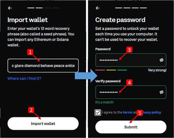 接着就是要依序输入12个英文字母的助记词,单字之间要空格,输入完成后点击「Import wallet」,接着就是建立个人钱包密码,重覆两次后,打勾,点击「Submit」。