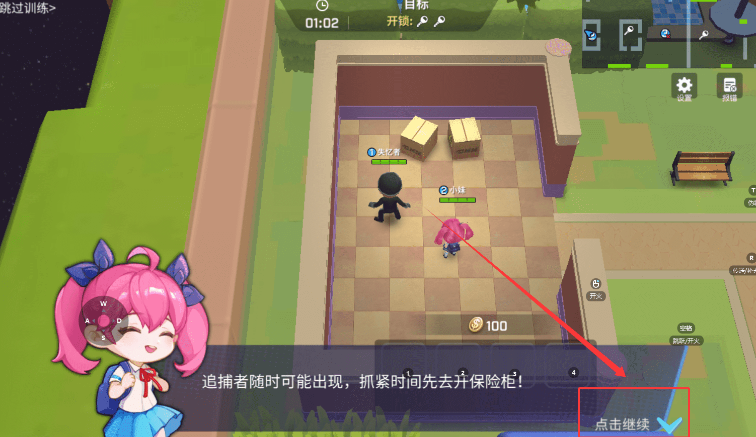 1、从第一张图可以看到,游戏目标是开锁,倒计时显示01:02,提示追捕者会出现,所以第一步要抓紧时间去井边的保险柜,点击继续按钮进入任务场景。