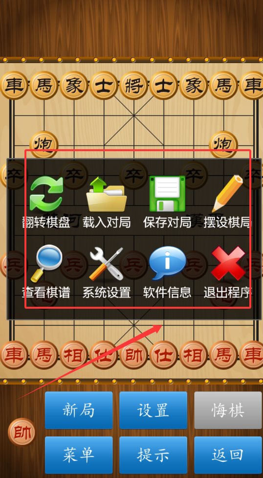 4、在菜单里还能找到“保存对局”、“载入对局”、“摆设棋局”等更多功能,方便你存档或研究特定局面,用完后可以选择“返回”或“退出程序”。