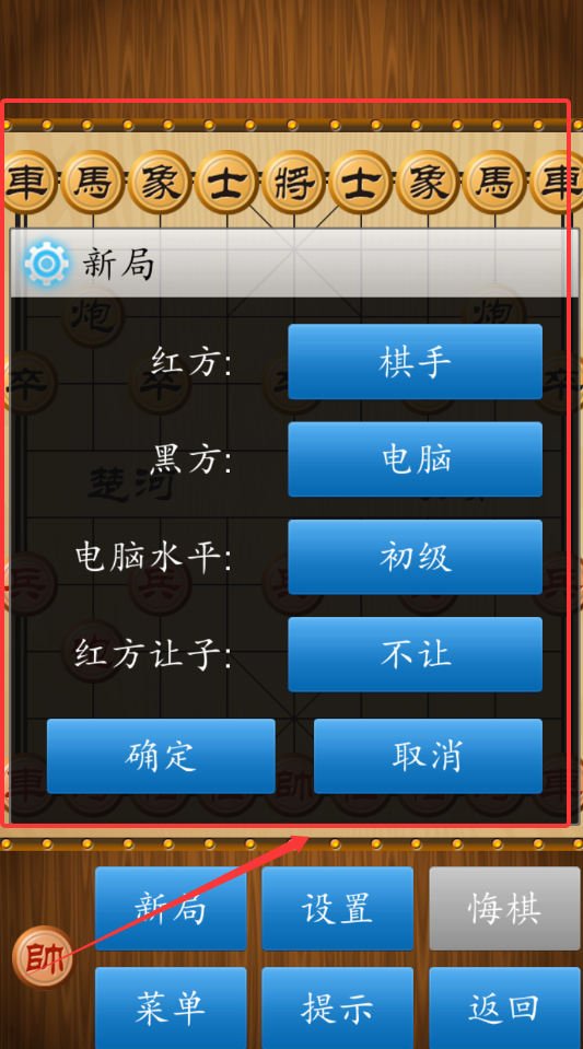 2、进入对弈设置界面后,你可以选择红方或黑方,调整电脑对手的难度级别,比如“初级”,设置好让子选项后,点击“确定”按钮就可以开始新棋局了。