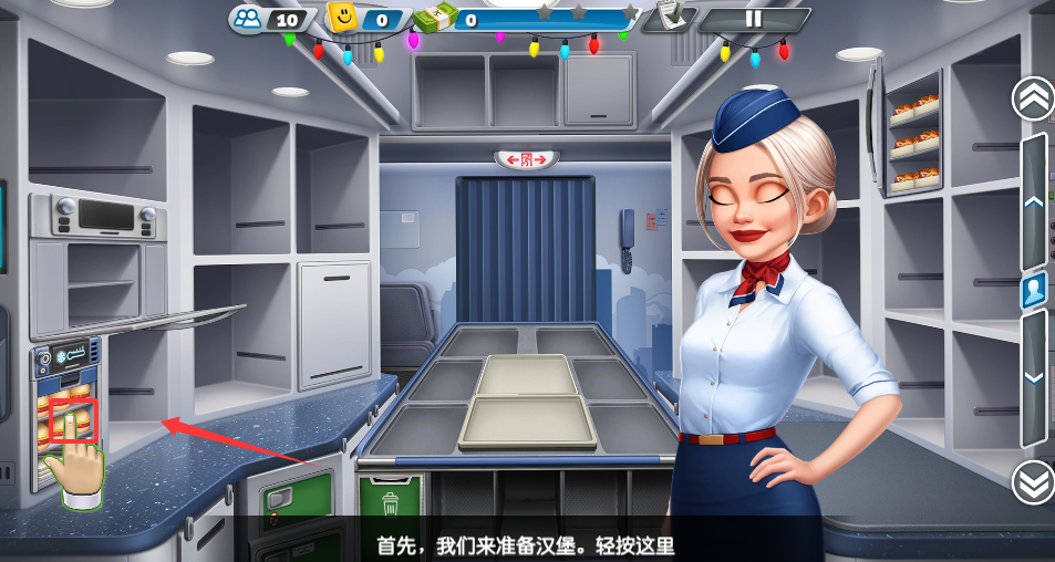 2、完成备餐后需立刻进入客舱提供服务,观察乘客头顶显示的食物需求图案,通过滑动屏幕将对应餐点准确递送,并优先处理像汉堡这样需要保持温度的主食。