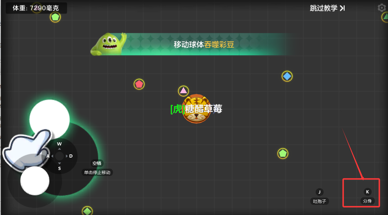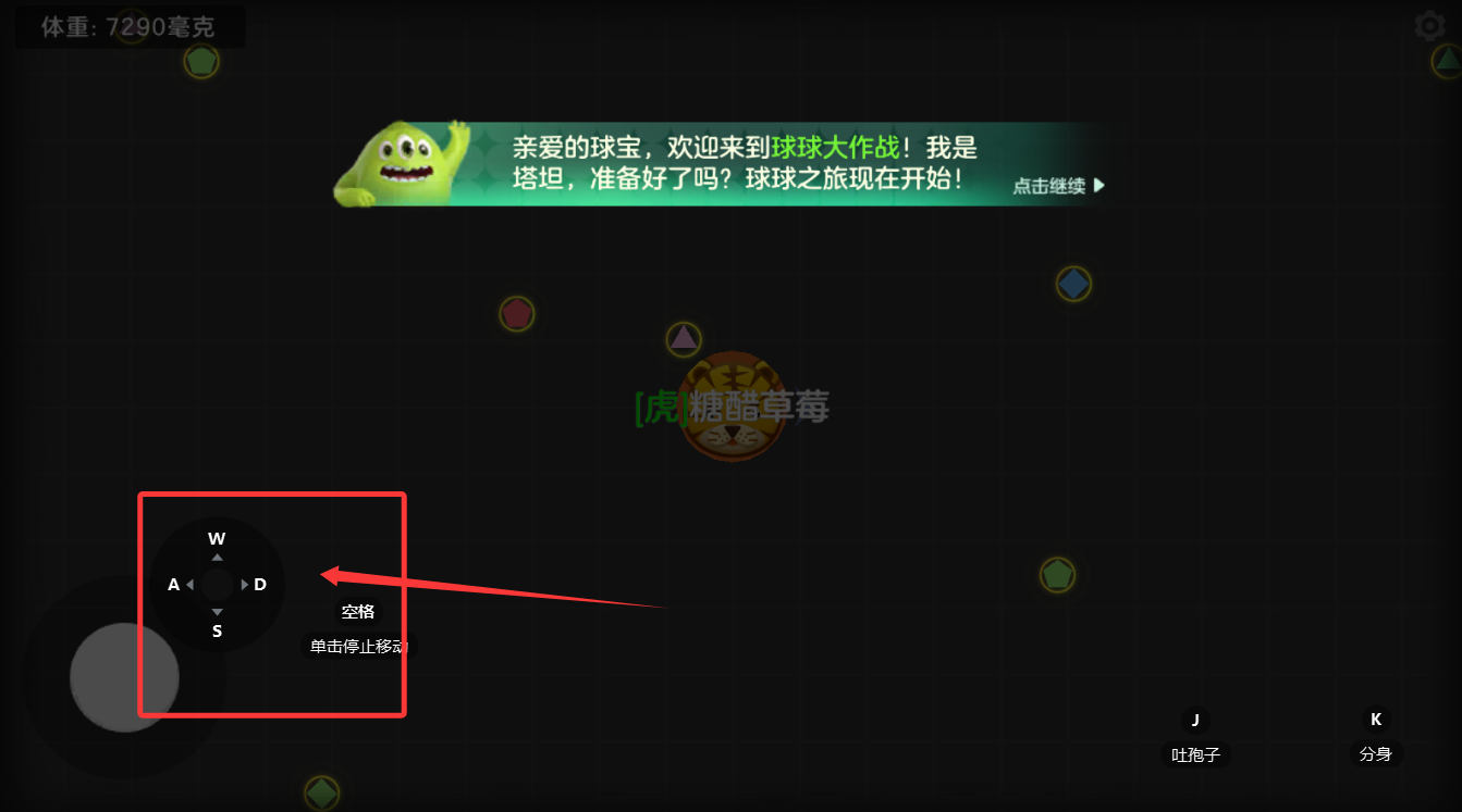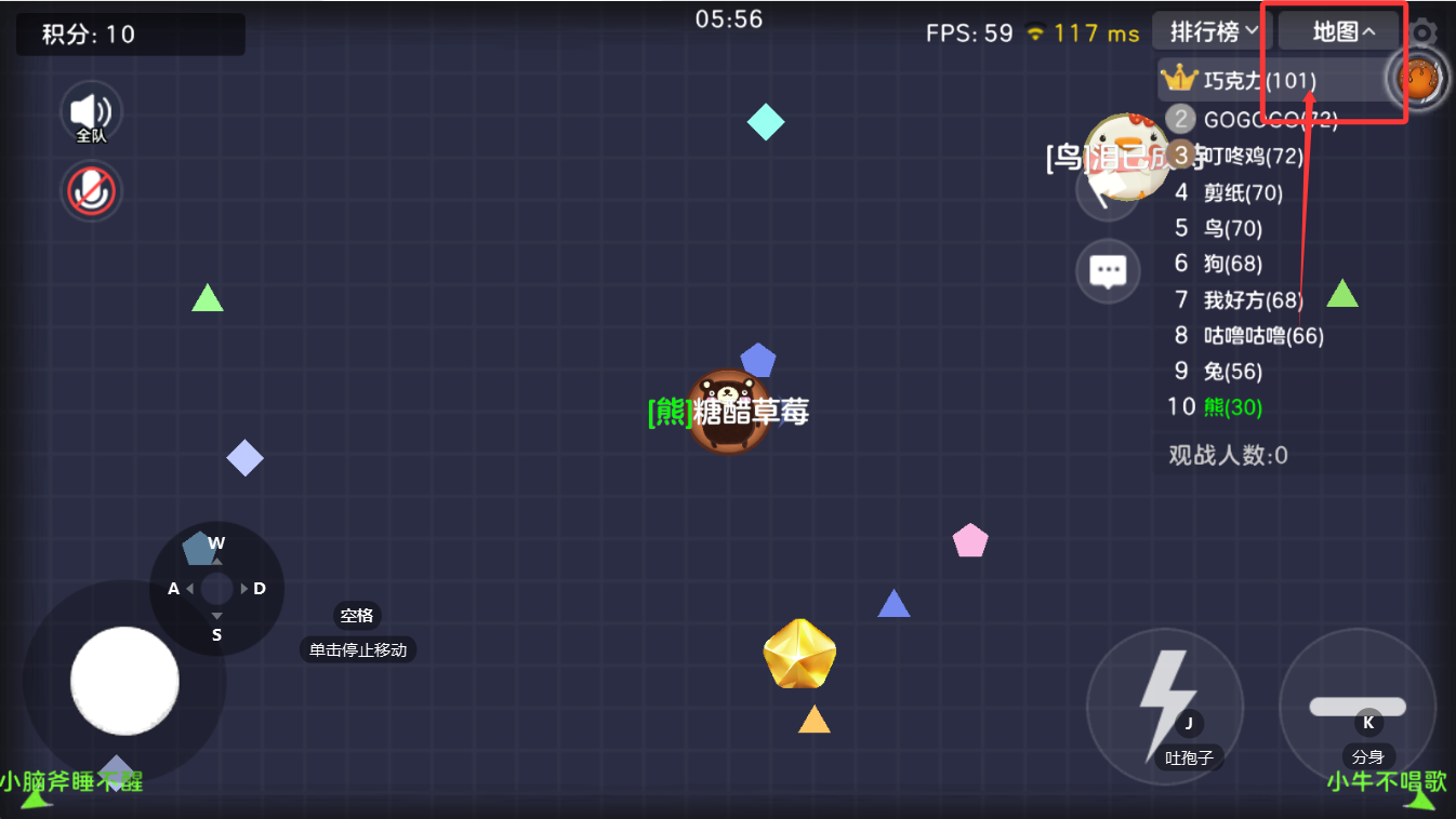 2、分身技巧的运用,当你需要快速逃跑或追击时,可以点击屏幕上的分身按钮,把球球分成好几个小球,这个技巧很实用。