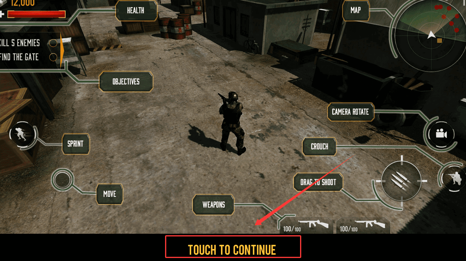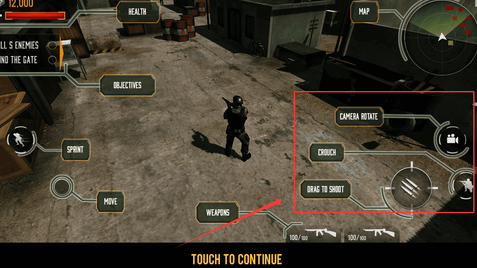 3、战斗时注意屏幕上的“DRAG TO SHOOT”或“TAP TO SHOOT”区域,拖动或点击这里就能开火。