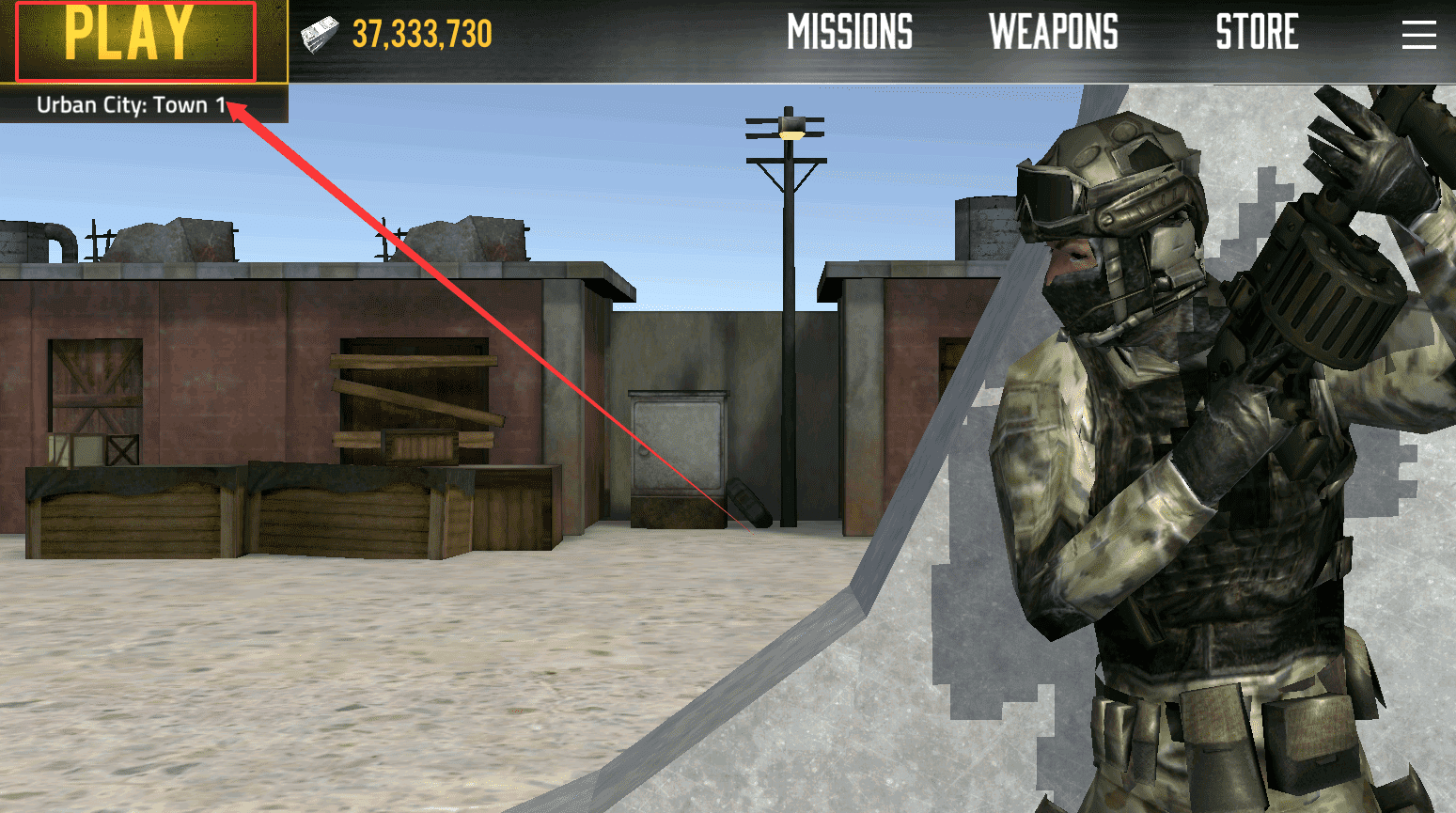 1、进入游戏后首先会看到主界面,上面有 PLAY、MISSIONS、WEAPONS、STORE 等选项。