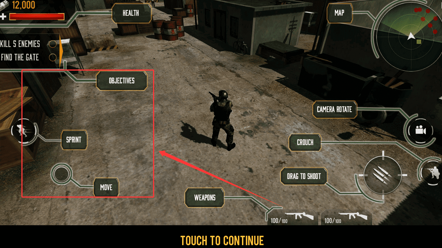 4、时刻留意左上角的“HEALTH”血量和“OBJECTIVES”任务目标,比如“KILL 5 ENEMIES”和“FIND THE GATE”。