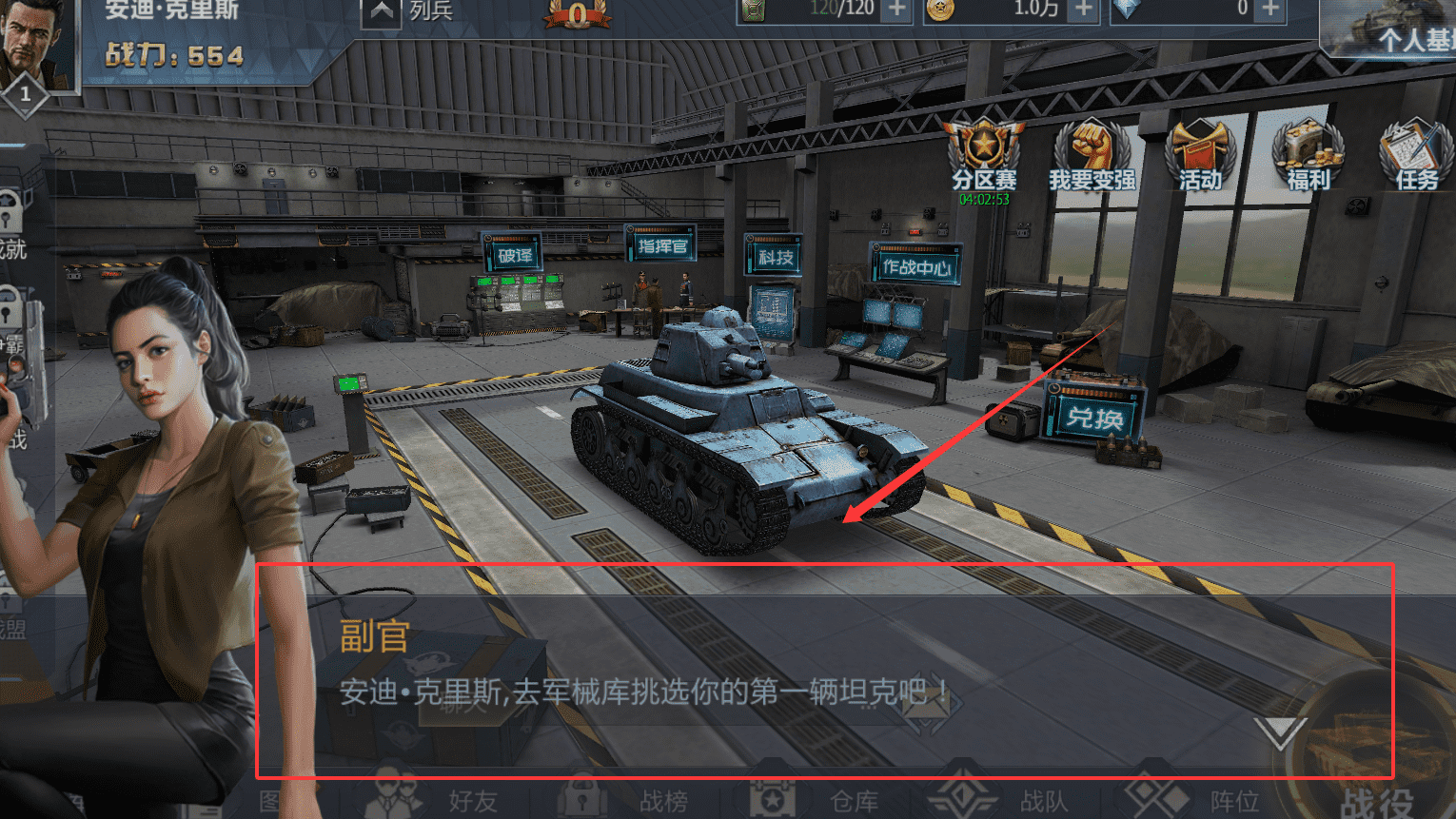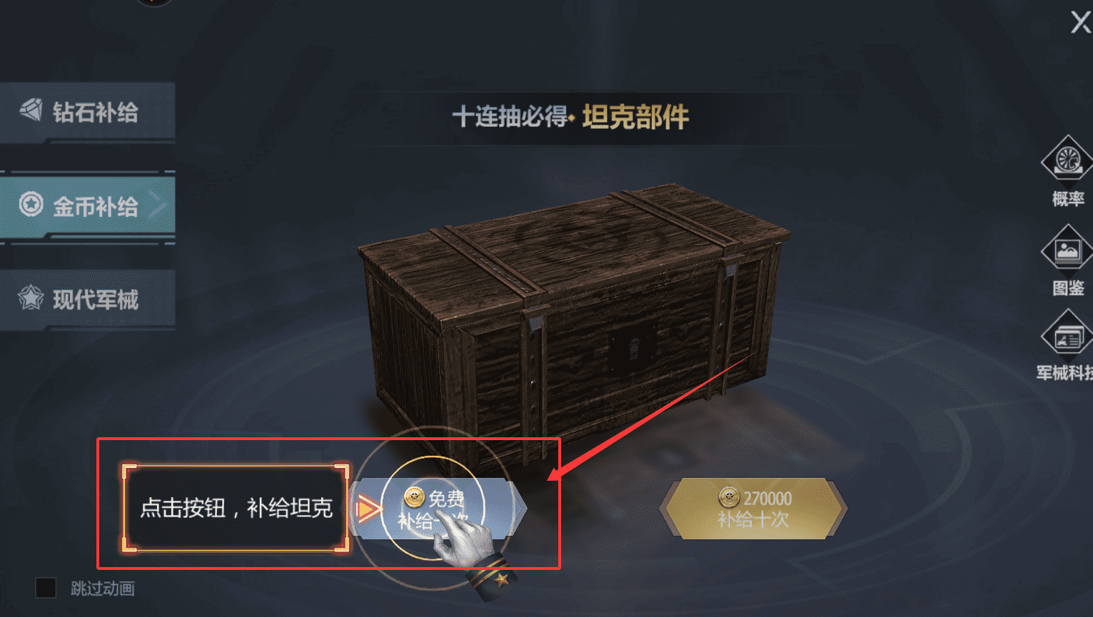 2、提升战力的关键是获取和强化军械。点击“金币补给”或“钻石补给”可以抽取坦克等装备部件。
