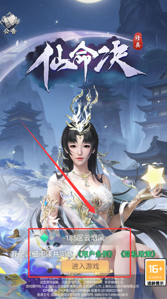 2、接着阅读并同意用户条例和隐私政策,点击进入游戏,在分区列表里选择新区例如185区云烟风。