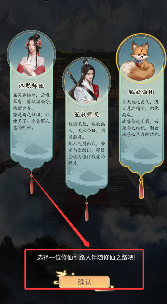1、首先呢,你需要选择一位修仙引路人,比如温柔的洛熙师姐、稳重的星辰师兄或者灵兽孤妖饭团。