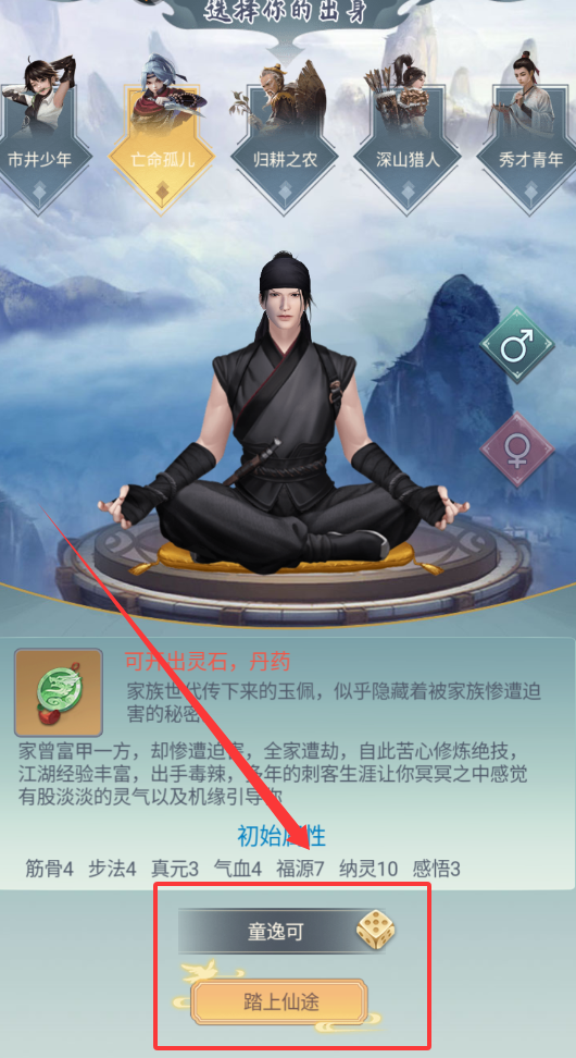 3、然后就是决定出身了,比如市井少年、亡命孤儿等,不同出身影响初始属性。