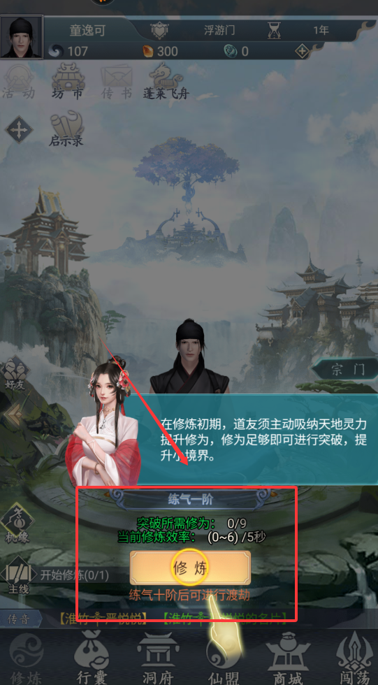 4、进入游戏后,主界面有活动坊甲等入口,初期要点击修炼按钮积累修为,从练气一阶开始突破。