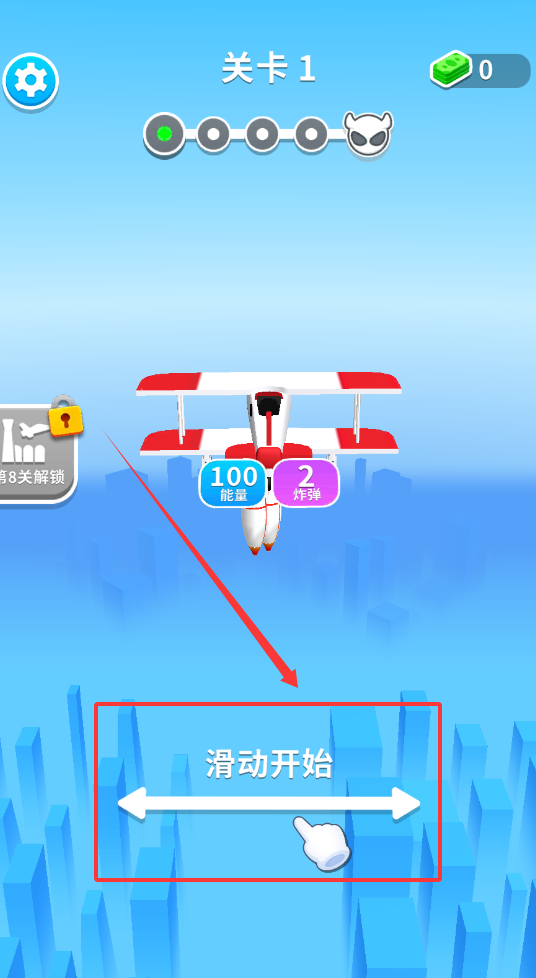 2、在关卡1界面中你会看到滑动开始的提示,用手指轻轻滑动屏幕即可启动关卡,同时注意收集路上的能量球和炸弹道具。
