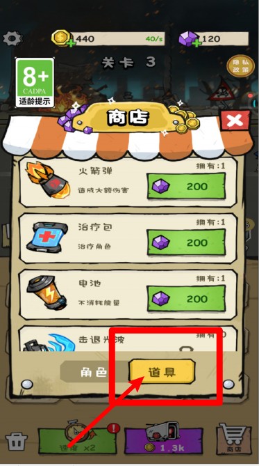 2.在商店中选择“道具”分类,可花费紫色宝石购买战斗辅助物品,提升输出、治疗或能量恢复效率。