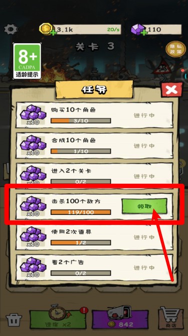 3.完成击杀敌人的任务目标后,点击“领取”按钮即可获得奖励,累计任务还能解锁更多资源与道具。