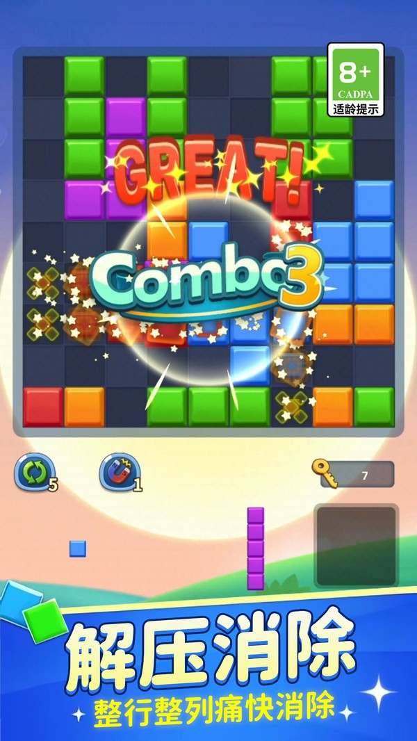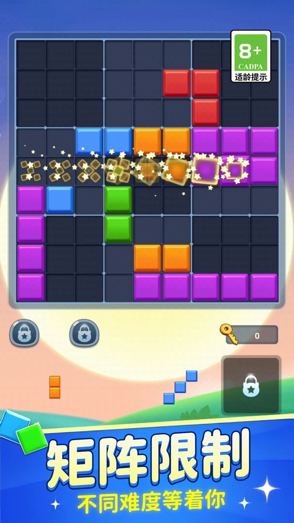 3、随着关卡推进方块掉落速度会显著提升,此时要快速决策并优先处理可能造成堆积的复杂形状,同时利用消除产生的短暂停顿思考下一步落点,保持场地的整洁才能有效应对。