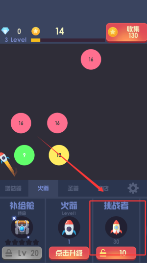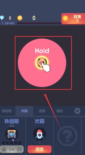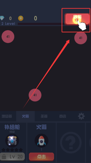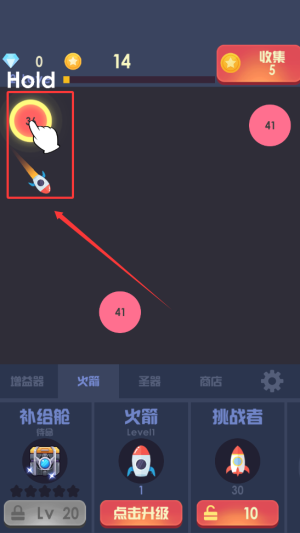 2、长按界面可集中火力攻击单一目标,提高清除效率,30关后解锁圣器系统,通过重置火箭换取收益加成,利用各类道具辅助战斗。