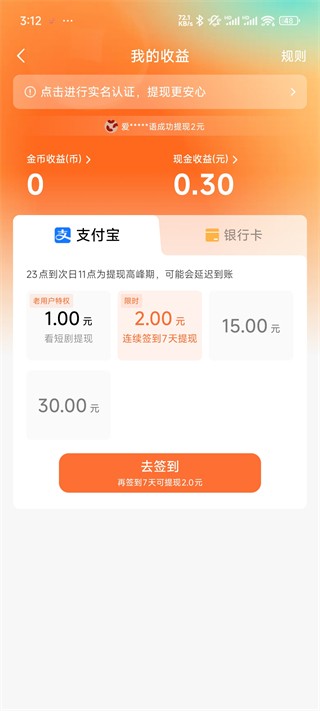 4、点击现金收益,这边可以看到是可以提现的,让你一边追剧还能另外赚点小钱钱。