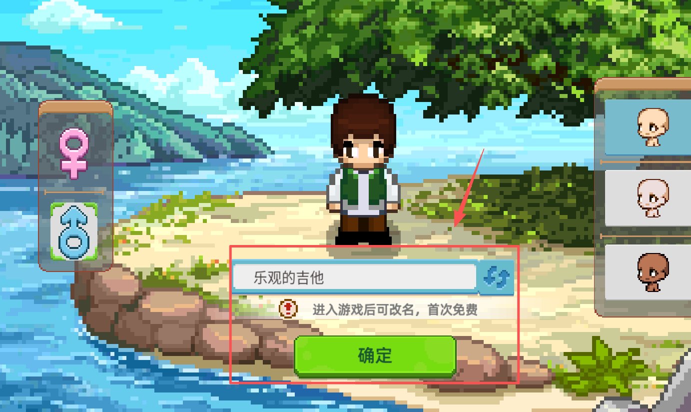 2、进入游戏后你会遇到角色命名界面,这里显示“乐观的吉他”作为默认名。