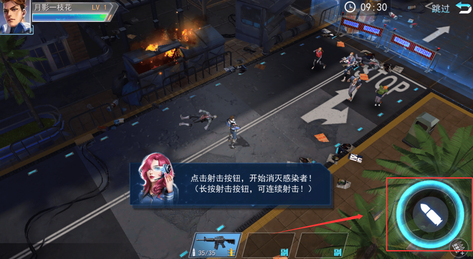 4、最后别忘了持续完成关卡任务,比如界面上显示的月影一枝花第一关,结合移动与射击操作,逐步提升等级。