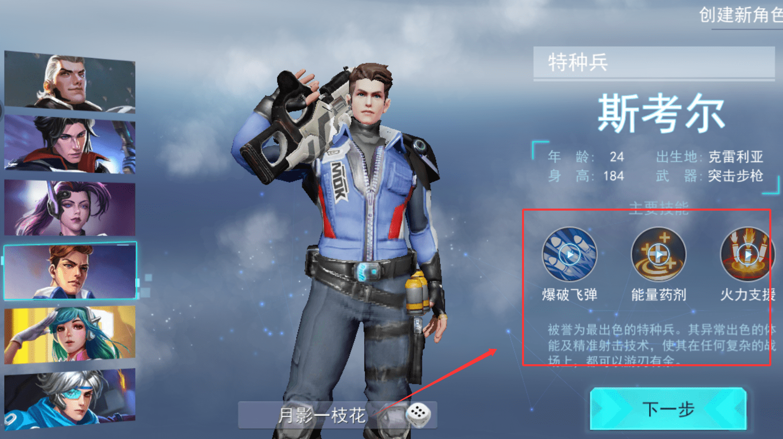 3、接下来可以解锁并体验特色角色,比如特种兵斯考尔,他擅长使用突击步枪,拥有爆破飞弹、能量药剂和火力支援等技能。