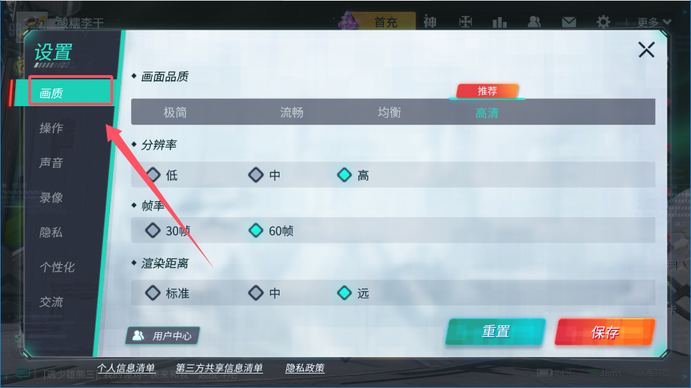 1、第一步是进入设置菜单,在游戏主界面找设置按钮,通常是个齿轮图标,点进去就能看到所有可调选项,包括画质、操作、声音、录像、隐私、个性化、交流等。