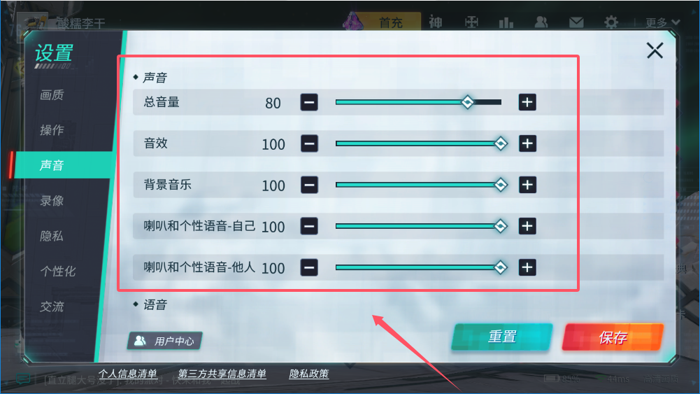 4、第四步完善声音和其他设置,在“声音”中调节各种音量平衡,确保能听清游戏音效和队友语音,其他如录像、隐私等设置可以按个人需求调整,所有设置完成后。