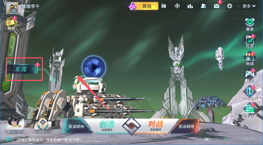 1、进入软件后别着急,先看看整个界面的布局。底部中央的“创造”和“对战”是两个主要的玩法入口,上面“车库”和“仓库”是管理你资产的地方,右上角是“任务”“商城”这类功能。