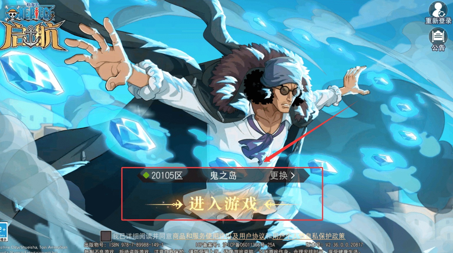 1、在游戏主界面找到 20105区 鬼之岛 ,点击进入后选择 更换 选项,接着仔细阅读并同意用户协议与私保护政策。