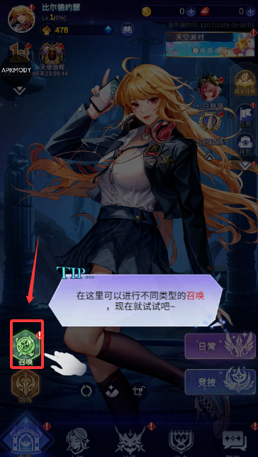 1、进入游戏后首先在大厅完成新手引导,核心是使用召唤功能收集首批神话女神角色,并初步了解装备熔炼与日常任务系统,为后续阵容组建打下坚实基础。