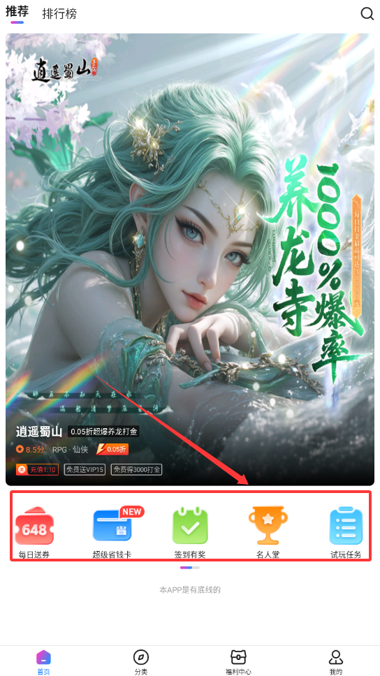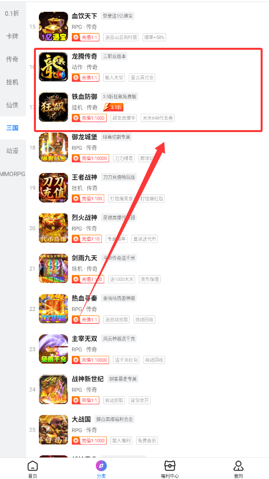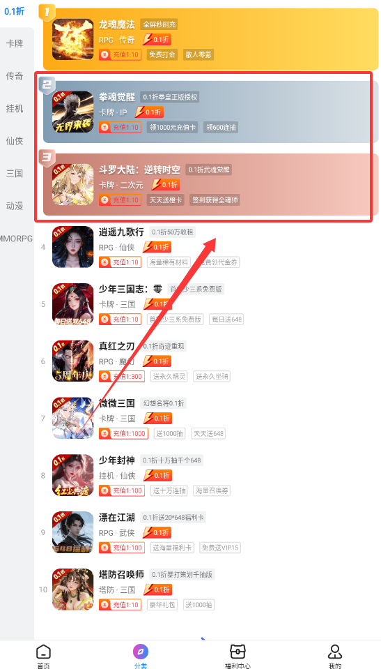 1、首先,你可以打开这类游戏平台,在首页就能看到很多0.1折的游戏推荐,比如卡牌、传奇、仙侠、三国等各种类型。