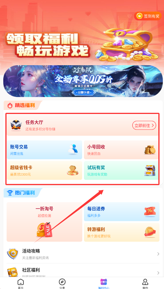 2、接着,别忘了去平台的“福利中心”或“精选福利”板块看看。那里常有“任务大厅”、“试玩有奖”、“每日送券”和“一折淘号”等活动。