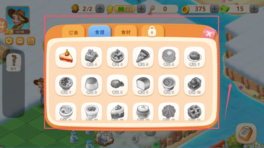 3、食谱制作关系到农场等级提升,你可以看到不同菜品对应的等级要求,从等级4的简单菜品开始尝试,随着经验积累逐步挑战更高级的料理,这样能稳步提升农场实力。