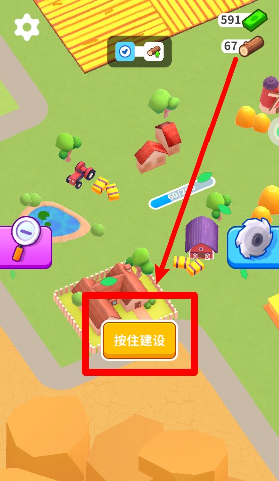 3.在建造界面中玩家可使用收集的木材与金币,长按“按住建设”按钮即可自由建造农场建筑,打造属于自己的天地。