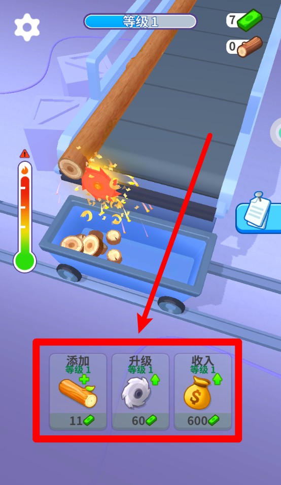 1.玩家可通过底部功能按钮进行木材添加、切割器升级与收益提升操作,不断增强切割效率,快速积累更多宝贵资源。