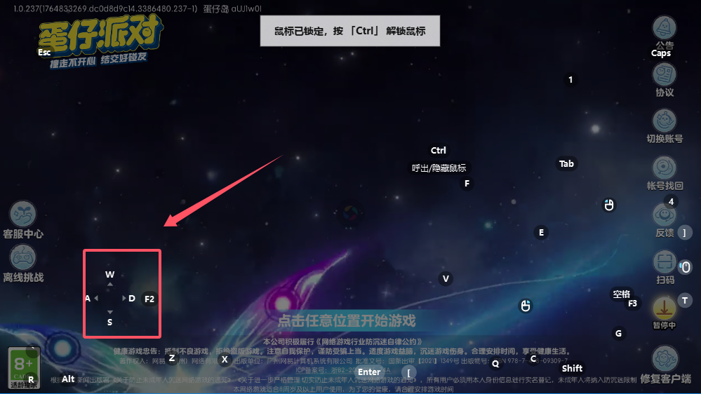 1、启动蛋仔派对后会看到色彩鲜艳的登录界面,有可爱的角色形象和“点击任意位置开始游戏”的提示,这时候界面上方可能会显示“鼠标已锁定”的状态。