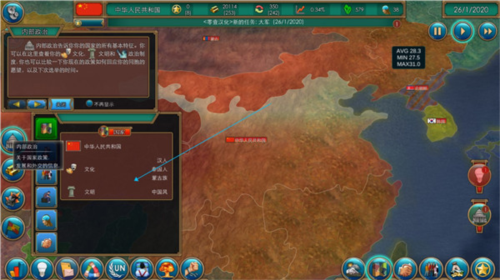 4、右侧面板集合了立法改革、科技研发与外交行动等决策入口,通过合理调配资源实现综合国力提升。