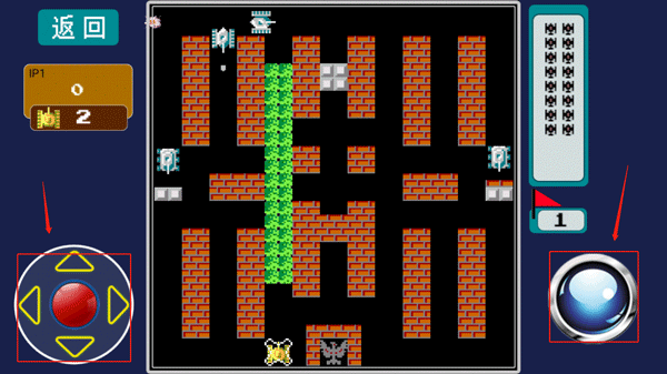 3、战场上分布着许多敌方坦克,你的任务是在保护自家老鹰基地的同时消灭它们。双方坦克的重生次数都有限制,界面左右两侧会实时显示剩余数量。