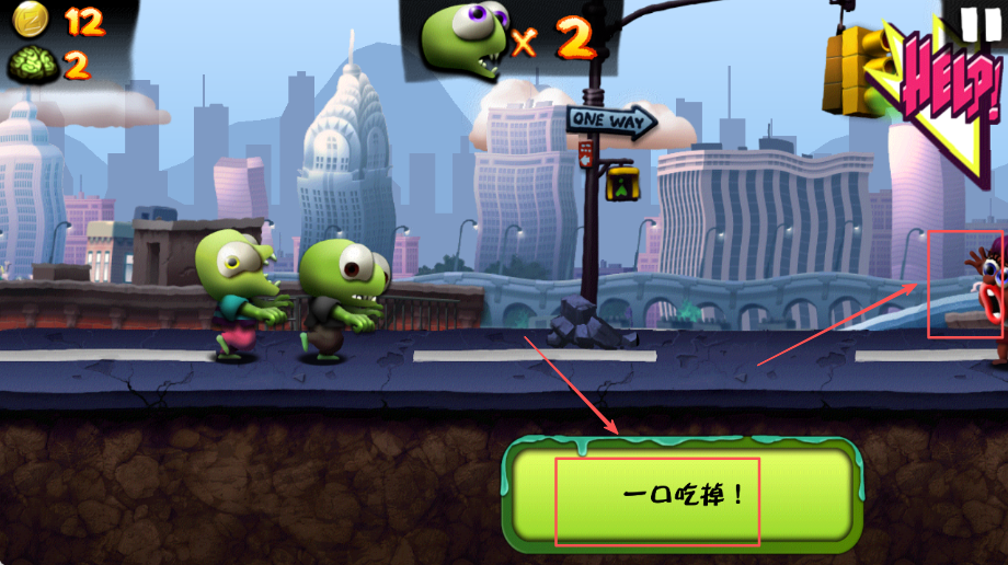 2、点击吃掉按钮让怪物吞食人类,将路人转变为僵尸扩充队伍,注意选择安全的吞食时机和位置。