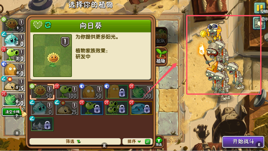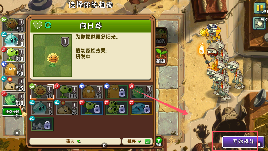 4、当卡组配置完全满意时,轻触右下角浓郁的紫色“开始战斗”确认钮,所有战略规划立即进入执行阶段,植物伙伴们将在智慧布局下展开守护家园的壮烈抗争。