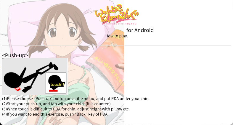 跟雏子一起做运动是一款趣味好玩的动漫模拟经营类小游戏,玩家能够与其中的动漫角色自由互动,作为早晨起来需要做运动来锻炼身体,那可就有很多运动方式了,无论是俯卧撑、仰卧起坐还是跑步等都可以给女主角不少的锻炼,想要保持一个完美的身材,不断的锻炼是非常必要的,就看玩家的操作了!
