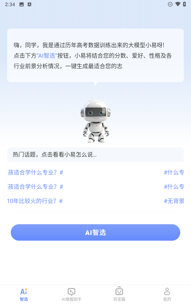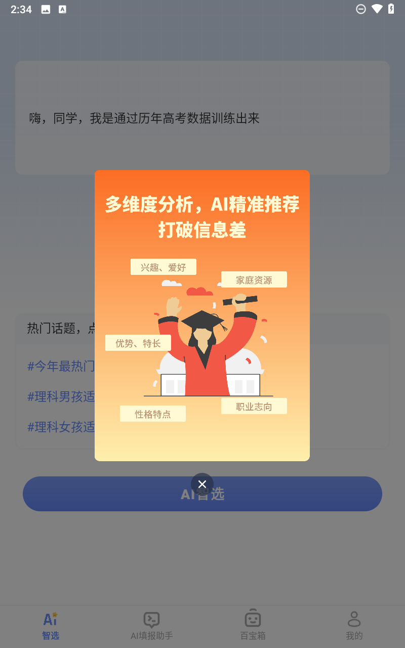 4、点击下方的“AI智选”按钮,让智能AI帮助你分析一下高考志愿。