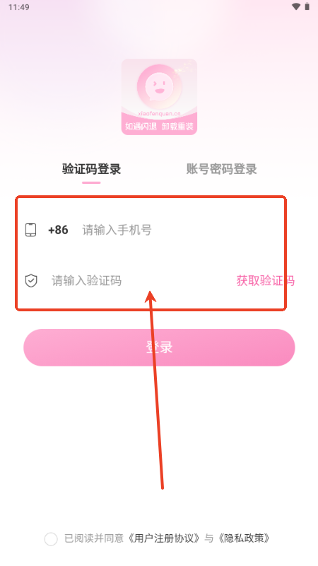 2、进入软件后,同意软件政策,去到用户的注册页面。