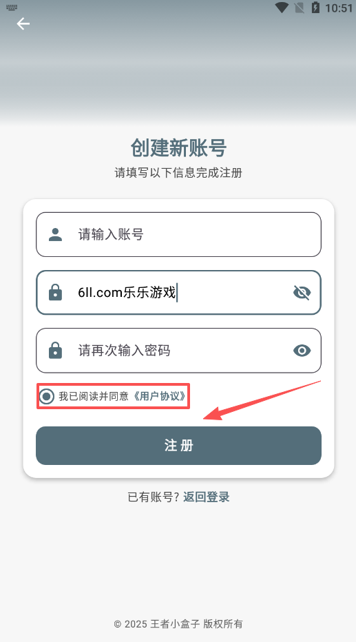 2、输入用户本人所使用的注册账号以及密码等信息,完成点击底部“注册”并勾选用户协议。