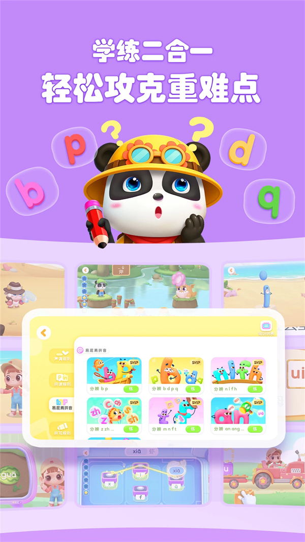 【宝宝巴士拼音】打造800+个趣味互动,覆盖拼音字母中的认、读、调、写、拼、练六个维度,帮助宝宝巩固拼音知识。
