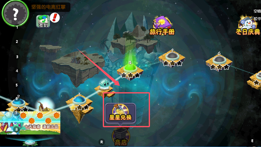 1、进入关卡场景界面,完成关卡挑战获取星星,关卡节点会显示当前星星数量,积累一定星星后,点击界面中的“星星兑换”按钮,进入兑换页面查看可兑换的道具列表。