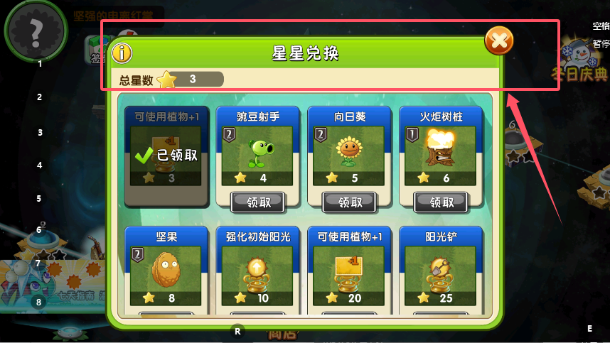 2、在星星兑换页面,查看总星数与各道具的星星要求,比如“坚果”需要8颗星星,星数达标的情况下,点击道具下方的“领取”键,即可获得对应的植物道具。