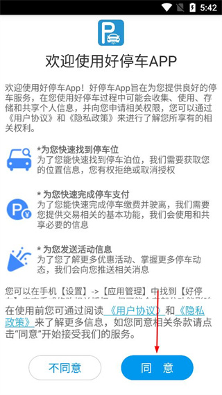 1、打开好停车APP,阅读页面展示的服务说明及权限申请,点击页面下方的同意按钮。