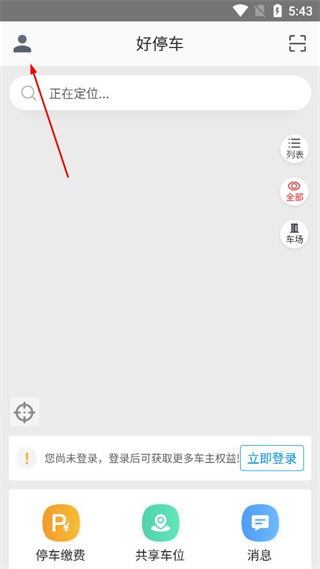 2、进入好停车主界面,点击页面左上方的头像图标,页面会跳转至登录界面。
