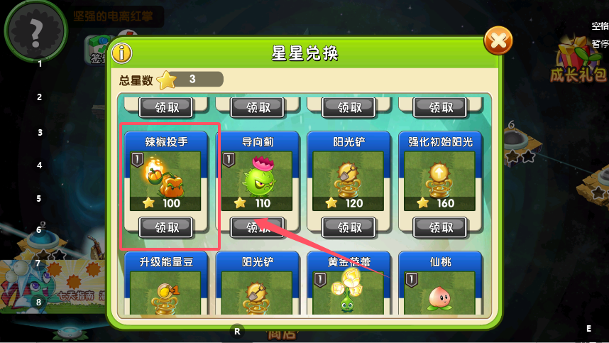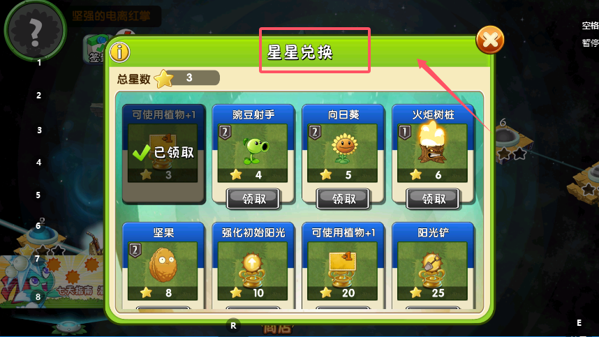 2、在星星兑换页面,查看总星数和每个道具所需的星星,比如“可使用植物+1”(第二档)需要20颗星星,星数达标的情况下,点击道具下方的“领取”键,就能获取对应的功能道具。